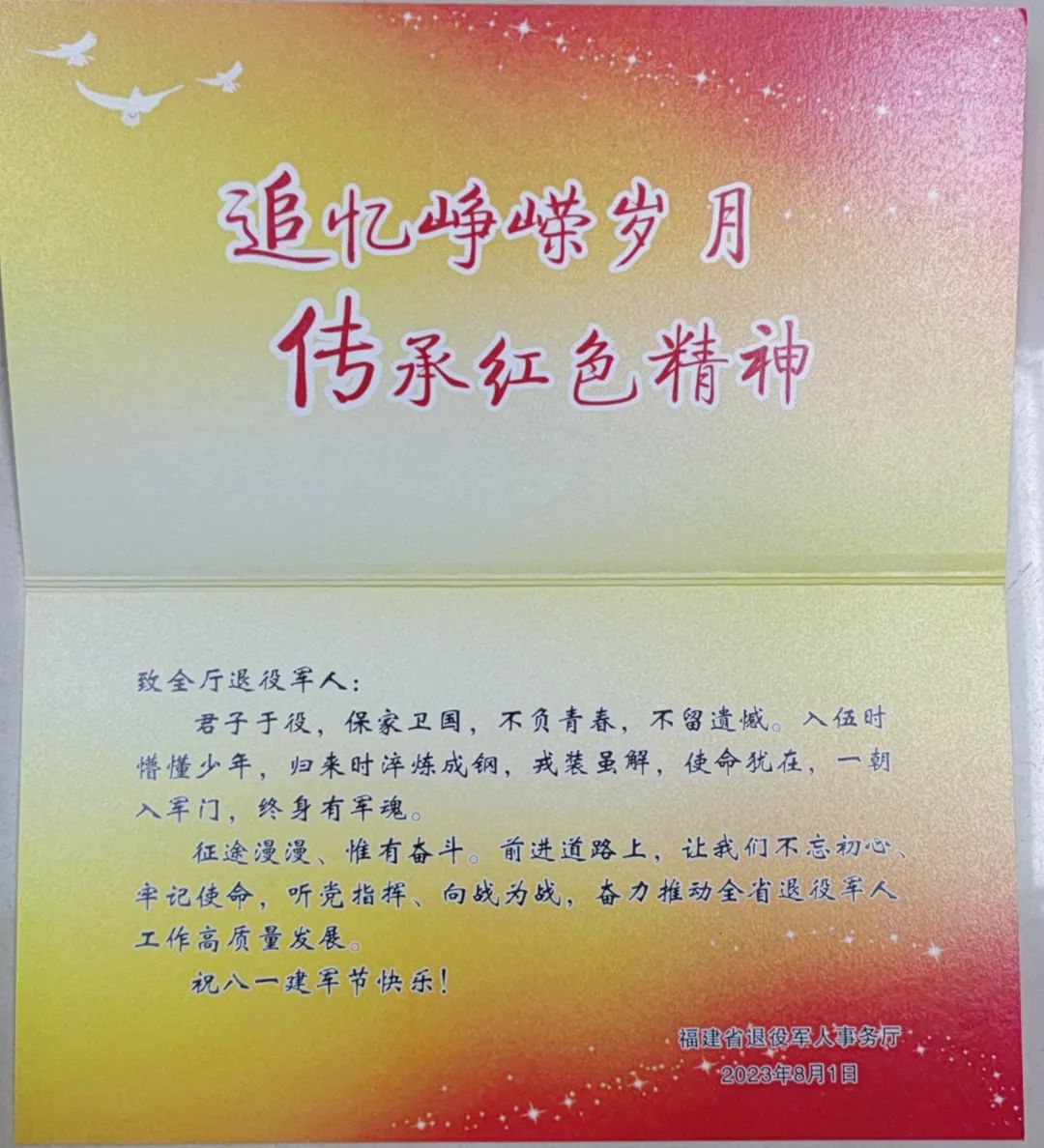 座谈会上,厅党组向全厅退役军人赠送贺卡和《习近平著作选读》等理论书籍,集体合唱《中国人民解放军军歌》《没有共产党就没有新中国》。梁晨磊、万小强、王江文、罗勋章、林玉琴、曾峻茂等6名同志作交流发言,大家回顾激情豪迈的军旅生涯,畅谈从事新时代退役军人工作的心得体会,一致表示深刻感受到厅党组的关心关怀和退役军人事务部门这个大家庭的温暖,将始终保持军人本色,对党忠诚、牢记使命、服务人民,始终保持军人品格,甘于奉献、主动担当、勇于拼搏,始终保持军人的纪律作风,服从命令、听从指挥,雷厉风行,以退役军人工作高质量发展的实际行动,让全省退役军人更加满意,让驻闽部队更加满意,让党委政府更加放心,为谱写中国式现代化福建篇章作出更大贡献。