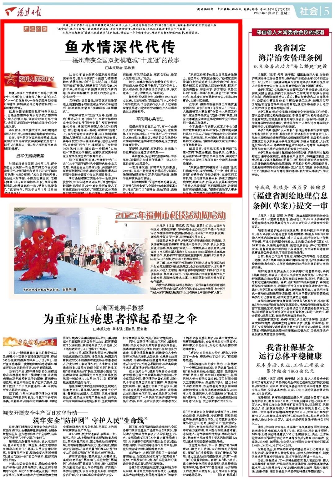 日前,在北京召开的全国双拥模范城(县)命名大会上,福建省共有23个市(县)榜上有名,实现全省所有设区市连续六届“满堂红”,成为全国唯一获此殊荣的省份,并创下新增数量、模范城(县)占比和县级数量等多个全国第一。福建日报推出“爱我人民爱我军”系列报道,讲述这一个个荣誉背后,福建军民鱼水情深的故事。今天来关注《鱼水情深代代传——福州荣获全国双拥模范城“十连冠”的故事》。