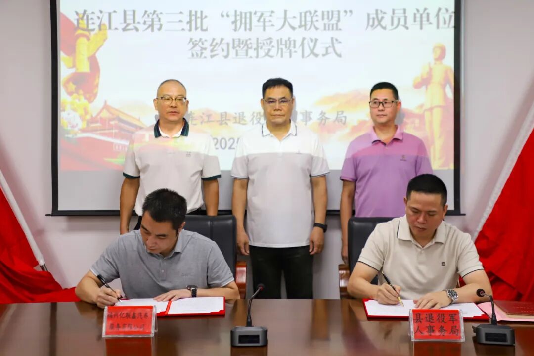 活动现场,连江县退役军人事务局与福州亿联鑫汽车服务有限公司、连江兴达汽车培训有限公司、福州龙强贸易有限公司、连江行知教育咨询服务部、连江和谐医院(仅签订补充协议)5家企业签订“拥军联盟”合作协议书,并进行授牌。
