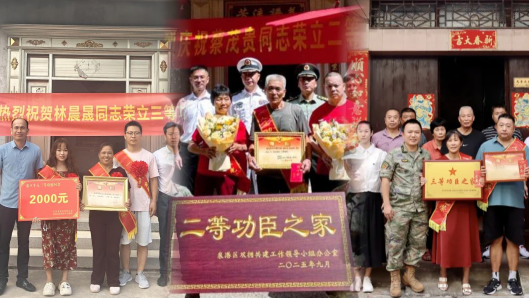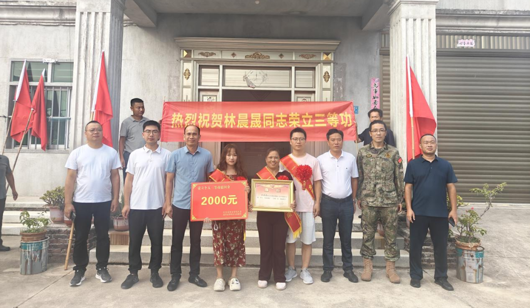 近日,莆田市秀屿区退役军人事务局、区人武部联合埭头镇村工作人员组成慰问组,为荣立三等功的现役军人林晨晟家庭送去立功喜报,共同庆祝这一荣耀时刻。