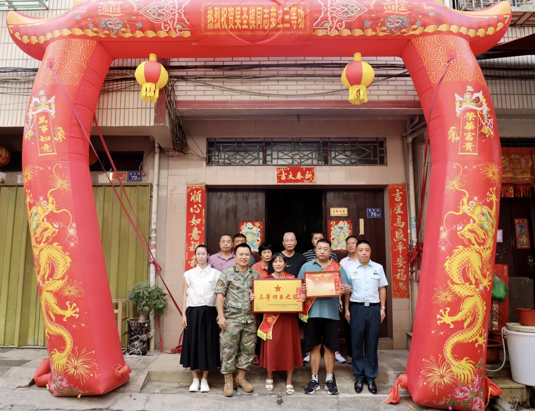 9月11日,南安市人武部政工科、南安市退役军人事务局、官桥镇武装部、镇退役军人服务站和村“两委”等多个单位负责人组成的慰问组,为官桥镇金庄社区荣立三等功的现役军人吴圣棋家庭送上立功喜报,共同见证这一荣耀时刻。