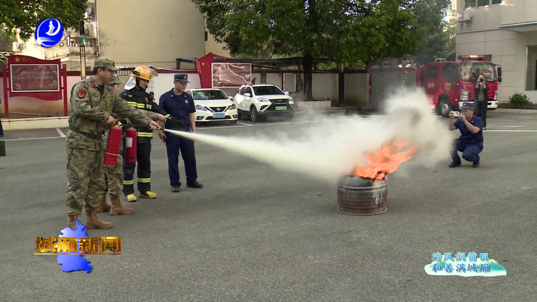 在实操演练中,消防专员重点介绍了灭火器的使用方法,演示灭火器“提、拔、握、压”操作要领,并让参与民兵现场演示实操。