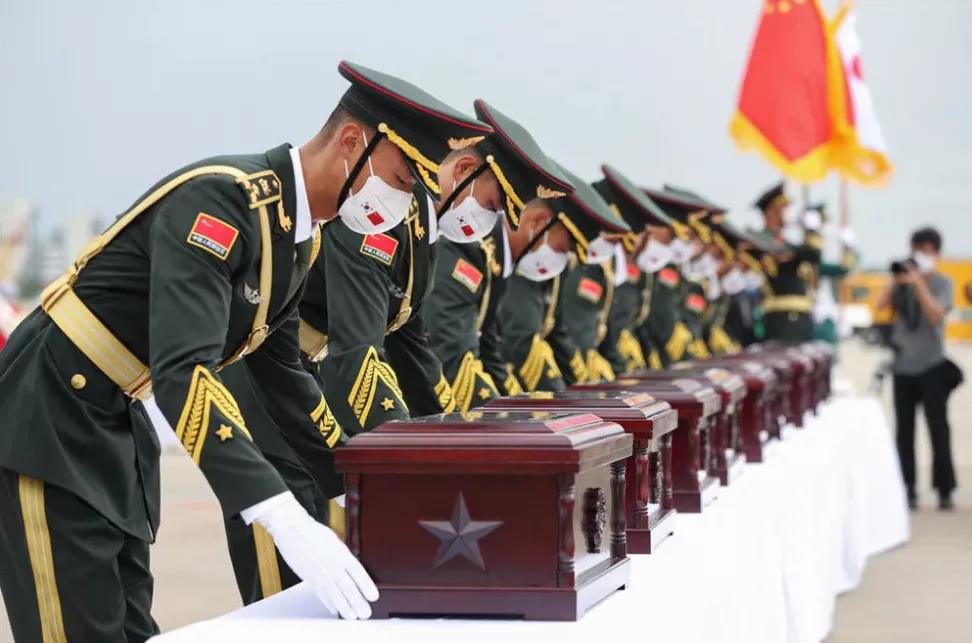 仪式现场气氛庄重,志愿军烈士遗骸的棺椁覆盖着鲜红的中华人民共和国国旗,到场迎接的解放军官兵军容威严、持枪伫立,现场全体人员向烈士遗骸三鞠躬。仪式结束后,志愿军烈士遗骸棺椁被护送前往沈阳抗美援朝烈士陵园。