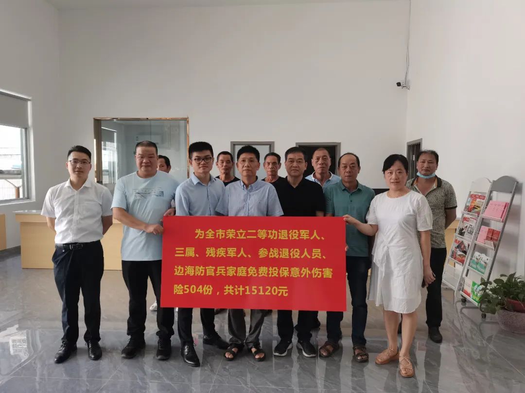 日前,福安市退役军人事务局与中国平安养老保险股份有限公司签订协议,为福安市荣立二等功退役军人、三属、残疾军人、参战退役人员、边海防官兵家庭五类人员免费投保意外伤害保险及平安附加意外伤害团体医疗保险共计504份,保费为每人每年30元。