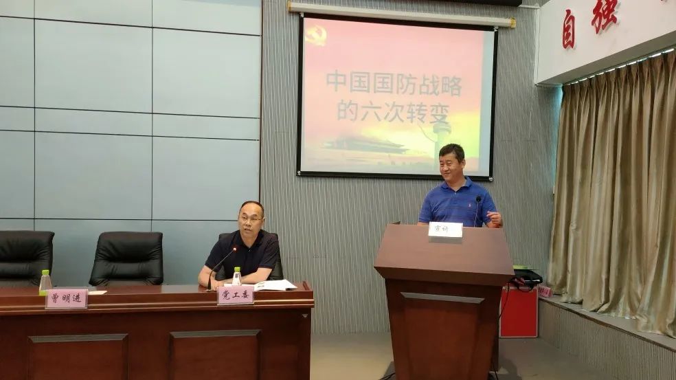国防教育宣讲团团员王志刚开展国防教育,讲述我国国防战略的六次转变,宣讲军队壮大历程和光荣传统,立足百年新起点,继续弘扬光荣传统。