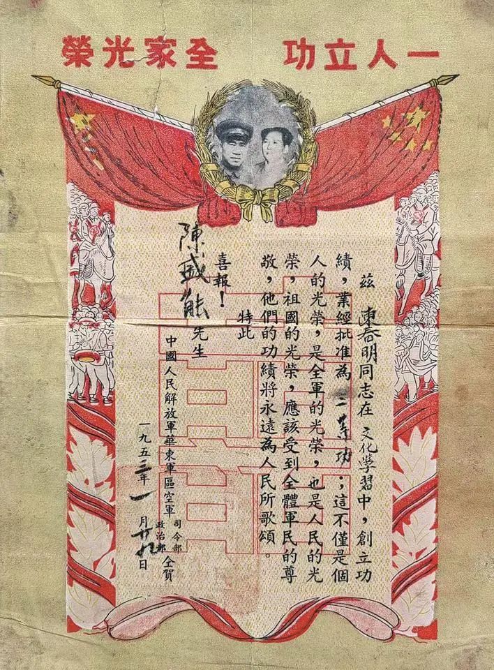 当年1月29日,华东军区空军司令部、政治部给陈春明家里寄喜报。同年5月16日,华东军区政治部发给陈春明《革命军人证明书》,落款署名为华东军区第三野战军司令员陈毅、政委饶漱石。