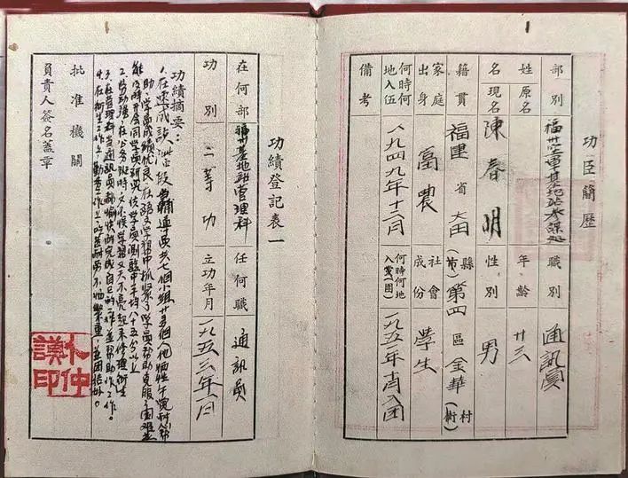 陈春明的家中至今保存完好《立功证书》,里面记录:语文学习时,发现困难及时开会一起研究,学员测试平均成绩85分以上,成绩优良;劳动强,在公务班时不误学习,天不亮起来打扫卫生;在管理科当通讯员,愉快完成自己的工作,并帮助其他人;在卫生、勤务工作上吃苦耐劳,不怕繁重,团结同志。