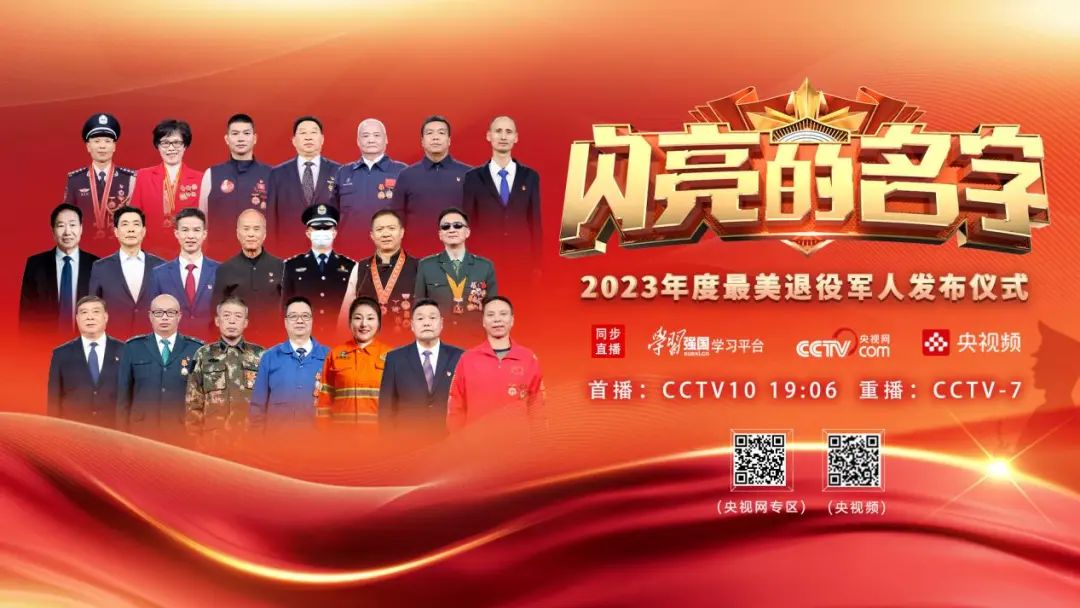 《闪亮的名字——2023年度最美退役军人发布仪式》将在中央广播电视总台央视科教频道(CCTV-10)11月27日19:06首播;央视国防军事频道(CCTV-7)重播。播出期间学习强国、央视频、央视网等新媒体平台同步直播。