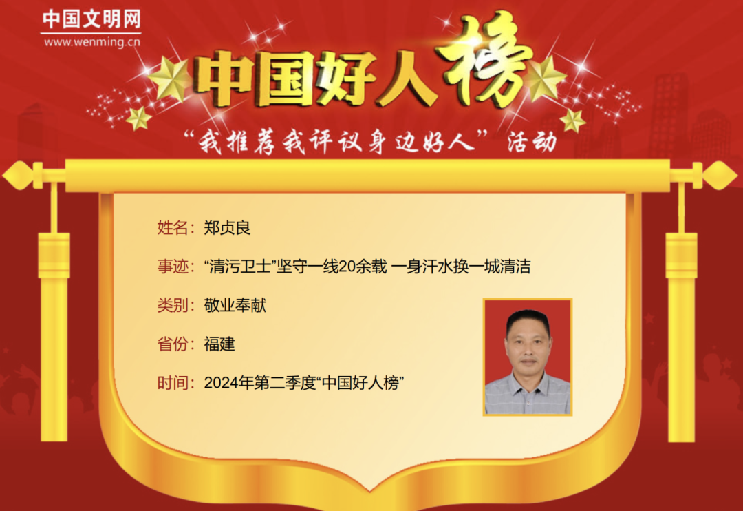 郑贞良,男,1970年11月生,中共党员,福建省福州市红庙岭垃圾综合处理中心监管服务一科科长。他勇于担当、不畏艰苦,扎根红庙岭填埋场,每天驾驶重型特种机械铲车处理生活垃圾,不辞辛苦来回穿梭在垃圾堆里,日工作时长最高达20小时。他用二十多年如一日的坚韧付出,兑现了“宁愿一人脏,换得万家洁”的承诺。曾获全国五一劳动奖章、全国劳动模范、全国优秀共产党员等荣誉。