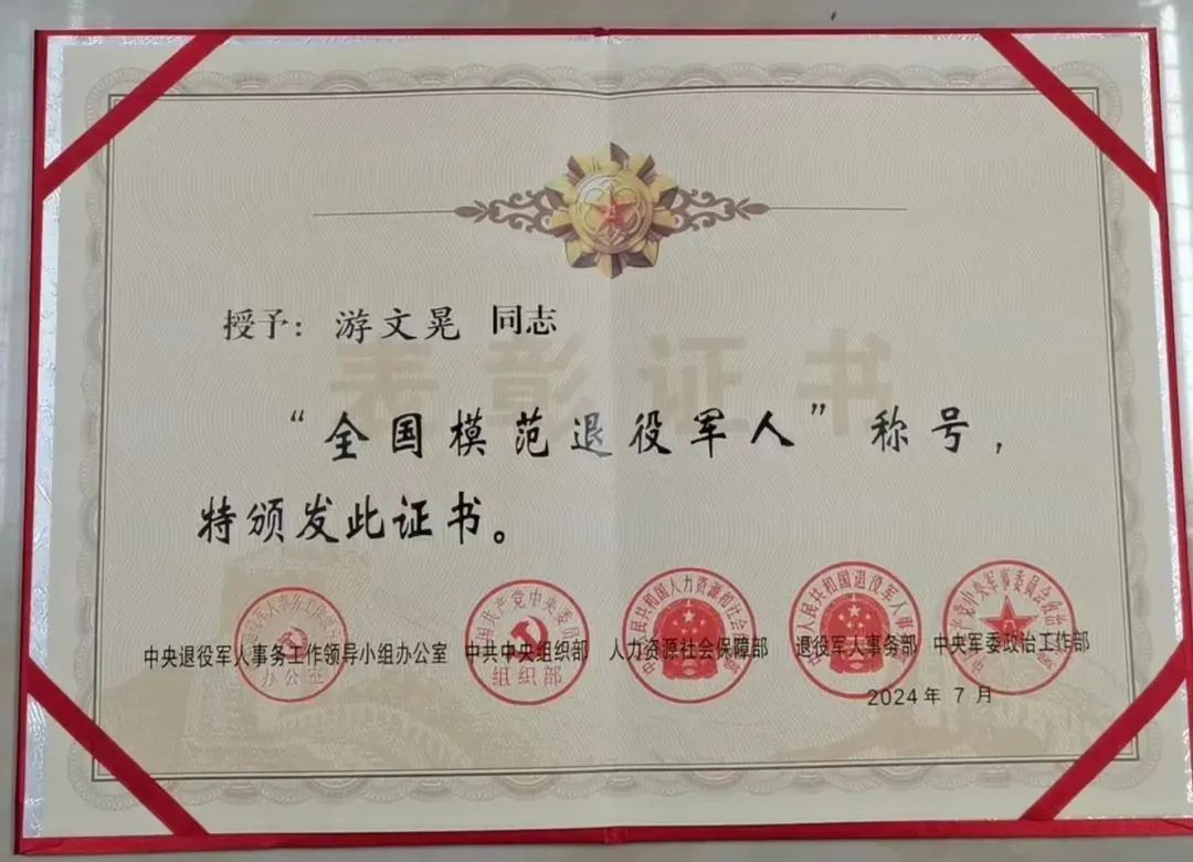 “八一”建军节前夕,7月29日,全国退役军人工作会议在北京召开,会议表彰了2024年全国模范退役军人和全国退役军人工作模范单位、模范个人。厦门市妇女儿童发展基金会副理事长游文晃荣获“全国模范退役军人”称号。“很荣幸能够获得这份荣誉,这份荣誉对我来说既是鼓励,也是一份责任。我将一辈子学雷锋做好事,把有限的生命奉献给慈善事业。”获奖后,游文晃说,往后将,尽己所能去帮助那些需要帮助的孩子们,助力更多的孩子实现梦想,改变命运。