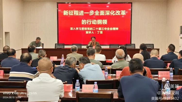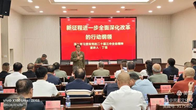 在8月10日举办的宣讲活动中,丁恒以《新征程进一步全面深化改革的行动纲领》为主题,从“深刻认识进一步全面深化改革的重要意义;准确把握进一步全面深化改革的丰富内涵;精准落实进一步全面深化改革的实践要求”等三个方面,并结合自己的学习体会和退役军人关爱工作情况,对党的二十届三中全会精神进行了深入浅出地解读。他强调,党的二十届三中全会,从党和国家事业发展全局的战略高度出发,审议通过了《中共中央关于进一步全面深化改革、推进中国式现代化的决定》。这是指导新征程上进一步全面深化改革的纲领性文件,是在新的历史起点上推进全面深化改革向广度和深度进军的再次总动员、总部署,必将为实现党的第二个百年奋斗目标提供强大动力和制度保障。我们要深刻领会全会精神,坚决拥护党中央的决策部署,以实际行动为改革发展稳定贡献力量。