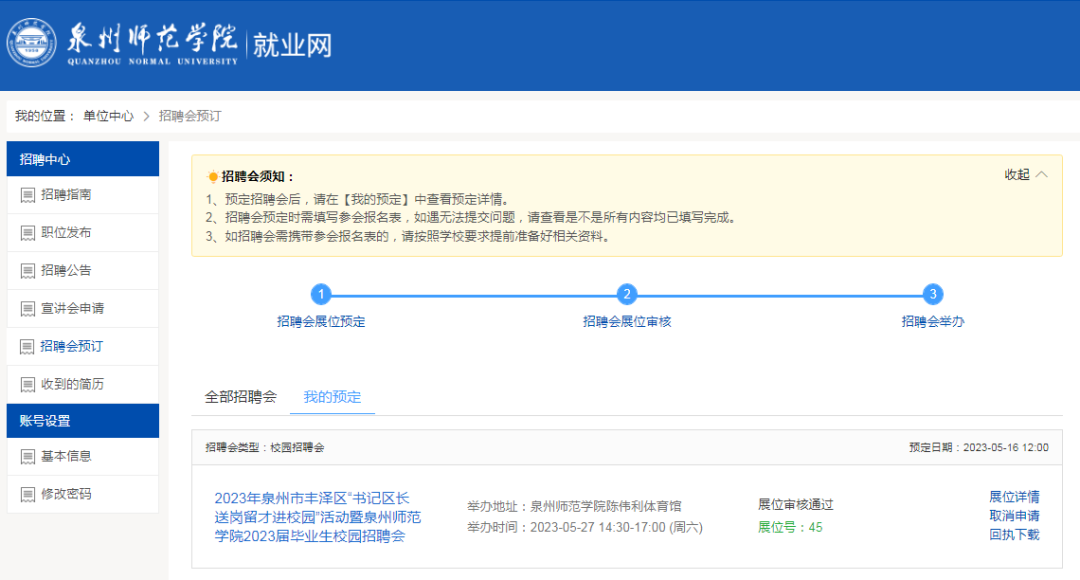 (一)凭证:参会单位登录后台,点击“招聘会预订”-“我的预定”,点击“回执下载”,下载并打印参会回执,加盖公司公章,入校和招聘会现场报到时出示回执进场。