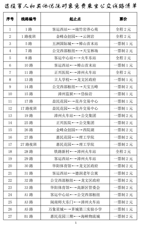 为贯彻落实《中华人民共和国退役军人保障法》,《福建省退役军人事务厅等28部门印发关于加强军人家属、退役军人和其他优抚对象优待工作实施办法的通知》精神,更好地推动新时代双拥共建工作,打造漳州新时代双拥特色品牌,在全社会营造拥军爱军浓厚氛围,漳州市退役军人事务局联合漳州市发展和改革委员会、漳州市财政局、漳州市闽运公共交通有限公司等7部门联合制定了《漳州市退役军人和其他优抚对象免费乘坐常规公交车和免门票游览部分景区园区实施方案》,专门对中心城区公交及部分国有A级景区首道门票免费进行统一规范。
