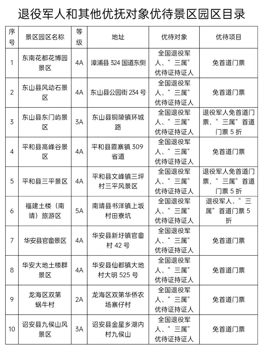 自5月20日起,漳州市中心城区(芗城区、龙文区)区域内43条线路260多辆公交车开始面向全国退役军人和“三属”(烈士遗属、因公牺牲军人遗属、病故军人遗属)持证免费。与此同时,包括5A级景区福建土楼(南靖)旅游区、4A级景区东山风动石等在内的10家国有A级景区(园区)也同步推出相关减免优待。