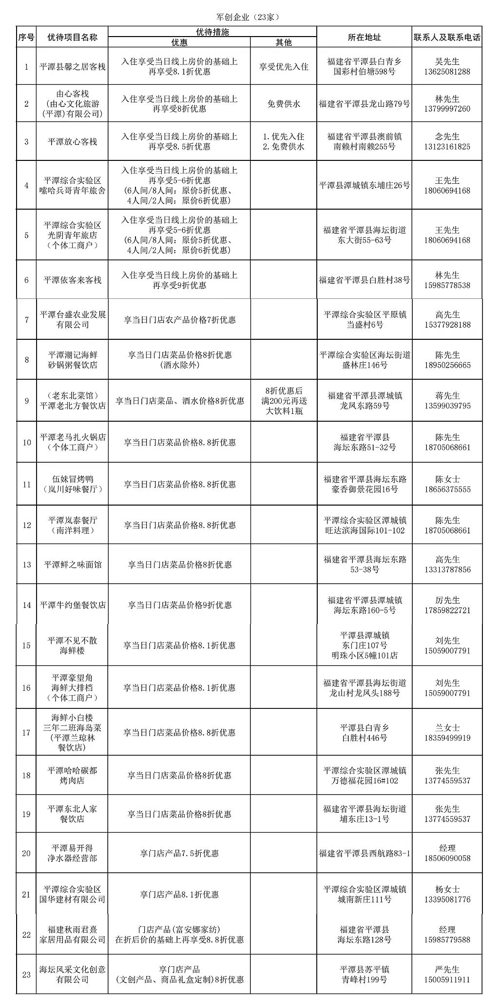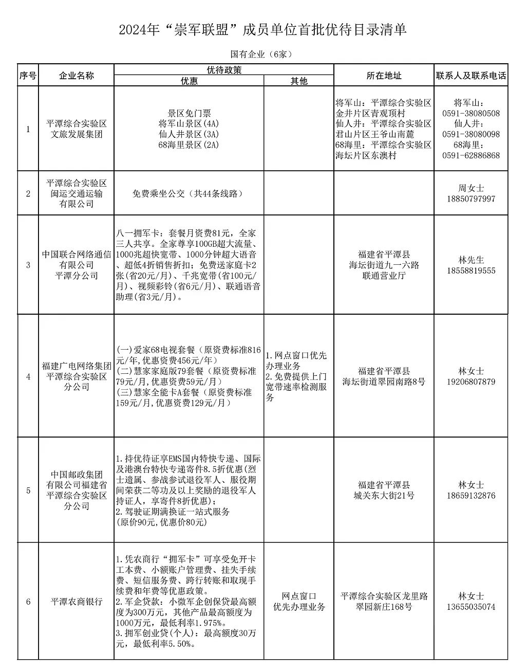 为大力营造拥军崇军的浓厚氛围,不断拓宽拥军优属“朋友圈”,全方位展现社会化拥军热情,全面彰显对现役军人、退役军人和其他优抚对象的浓浓尊崇之情,不断提升广大老兵的获得感、荣誉感、幸福感。平潭综合实验区面向全国现役军人、退役军人和其他优抚对象推出2024年首批优待项目清单,共计三大类49家。其中,国有企业6家、军创企业23家、拥军企业(商户)20家,涵盖旅游景点、餐饮美食、酒店住宿、生活服务、医疗健康、交通出行等优待服务项目。请战友查收!