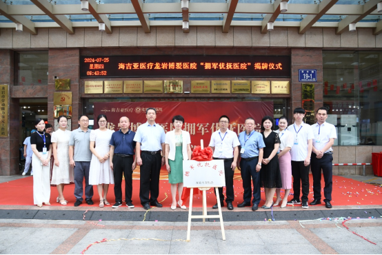 为大力弘扬拥军优属光荣传统,扎实做好退役军人和其他优抚对象的优待工作,7月25日上午,龙岩又一家“拥军优抚医院”的揭牌仪式在龙岩博爱医院举行。龙岩市退役军人事务局党组书记、局长张华玉,二级调研员张锦伟,龙岩博爱医院党支部书记、院长刘斌出席揭牌仪式,龙岩市卫生健康委员会和龙岩市区两级退役军人事务局相关同志、龙岩博爱医院医务工作者和退役军人代表共80余人参加仪式。
