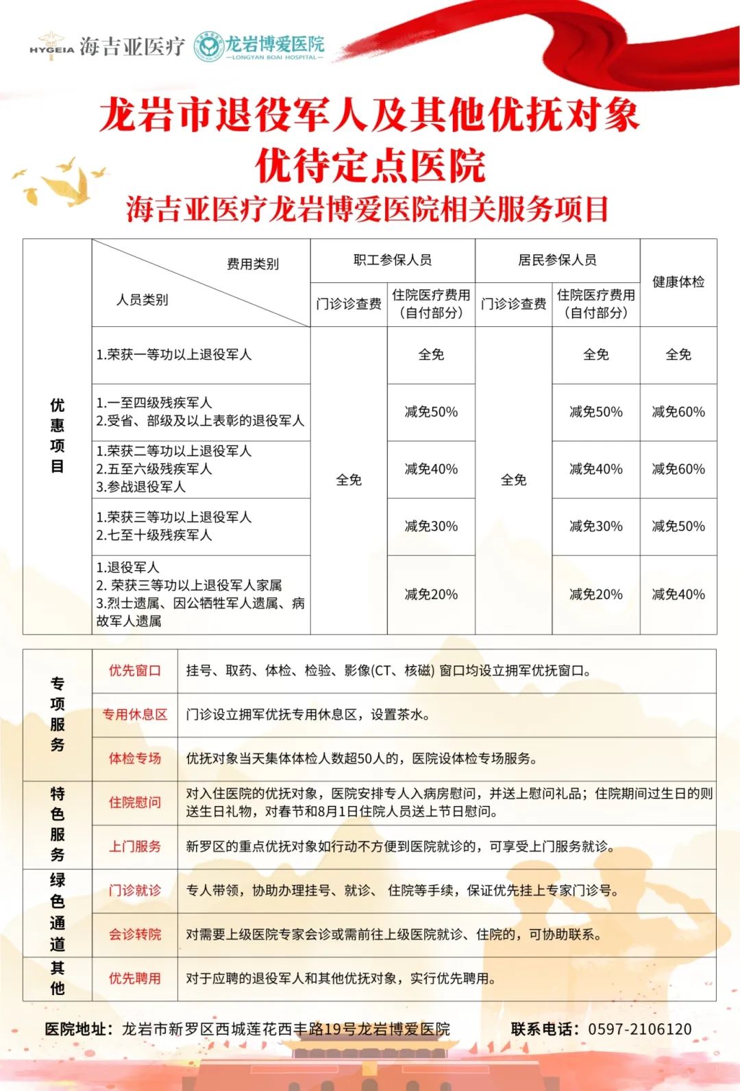 在龙岩博爱医院成立拥军优抚医院是深化落实医疗拥军政策,为广大退役军人和其他优抚对象“解难事、做好事、办实事”的务实举措。