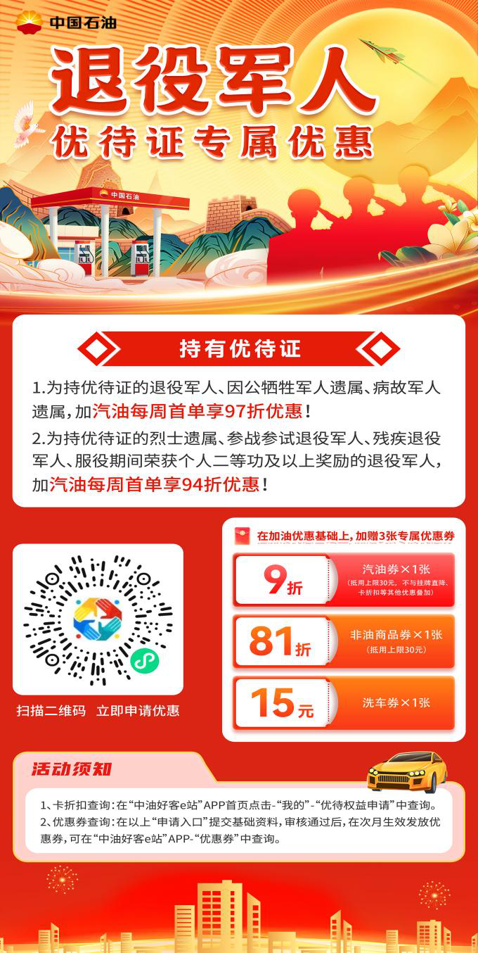 即日起,中国石油福建销售公司为持优待证的退役军人和因公牺牲军人遗属、病故军人遗属提供“每周首单优惠”享97折加油优惠;