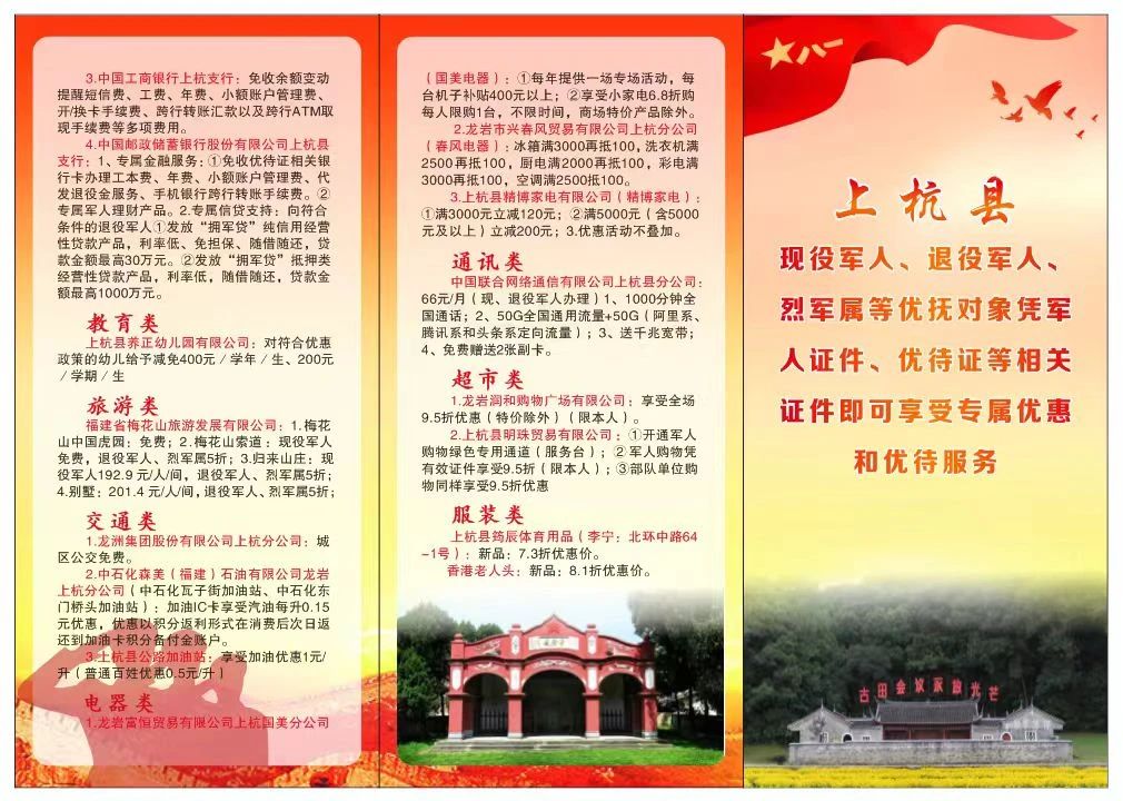 梅花山景区门票免费,城区公交免费乘坐,幼儿学费减免,多家酒店住宿优惠,多家超市购物优惠……当前,上杭县优待证陆续“上新”优待服务项目,已有9大类22小项,通过不断拓宽优待证使用场景,已在衣食住行各方面凸显好用、实用功能,彰显着上杭县对退役军人和“三属”对象的浓浓尊崇之情,不断增强了广大老兵的获得感、荣誉感、幸福感。