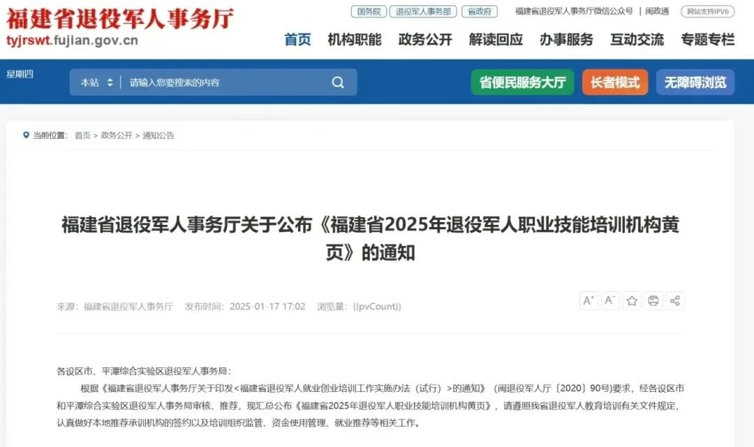近日,福建省退役军人事务厅公布《福建省2025年退役军人职业技能培训机构黄页》,其中厦门市2家教师资格证考前培训承训机构入选,分别是集美大学和厦门市金海峡高级人才培训中心。符合条件且有意从教的自主就业退役士兵可免费报名参加。