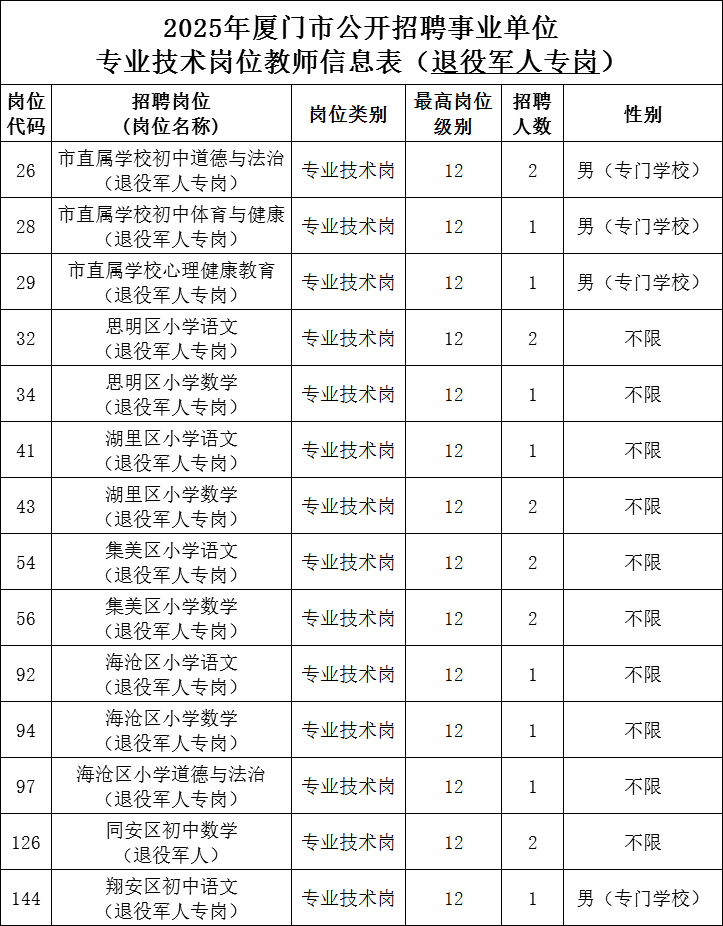 此次招聘再次设立退役军人专岗,总共20个。符合中小学教学岗位条件、厦门市户籍或厦门市接收安置的自主就业退役士兵或复员干部可报考。