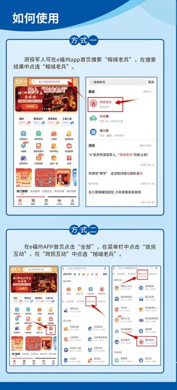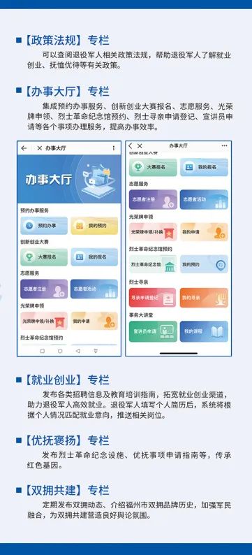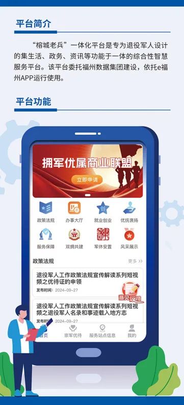 “榕城老兵”一体化平台(福州市“网上退役军人事务局”)依托“e福州”APP运行。开设政策法规、办事大厅、就业创业、优抚褒扬、服务保障、双拥共建、军休动态、崇军优待、服务站点信息等服务版块,提供服务中心(站)预约办事、创新创业大赛报名、志愿者注册、光荣牌申领、革命烈士纪念馆预约、宣讲员申请、拥军优属商业联盟申请及查询等服务。