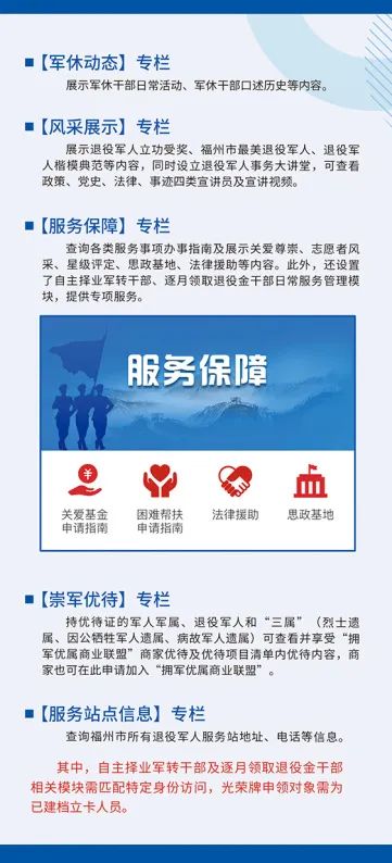 3月7日,福州市在全省率先推出退役军人和其他优抚对象持证人的优待证(电子版)在“榕城老兵”一体化平台申领发放,标志着福州市“网上退役军人事务局”开始上线试运行。
