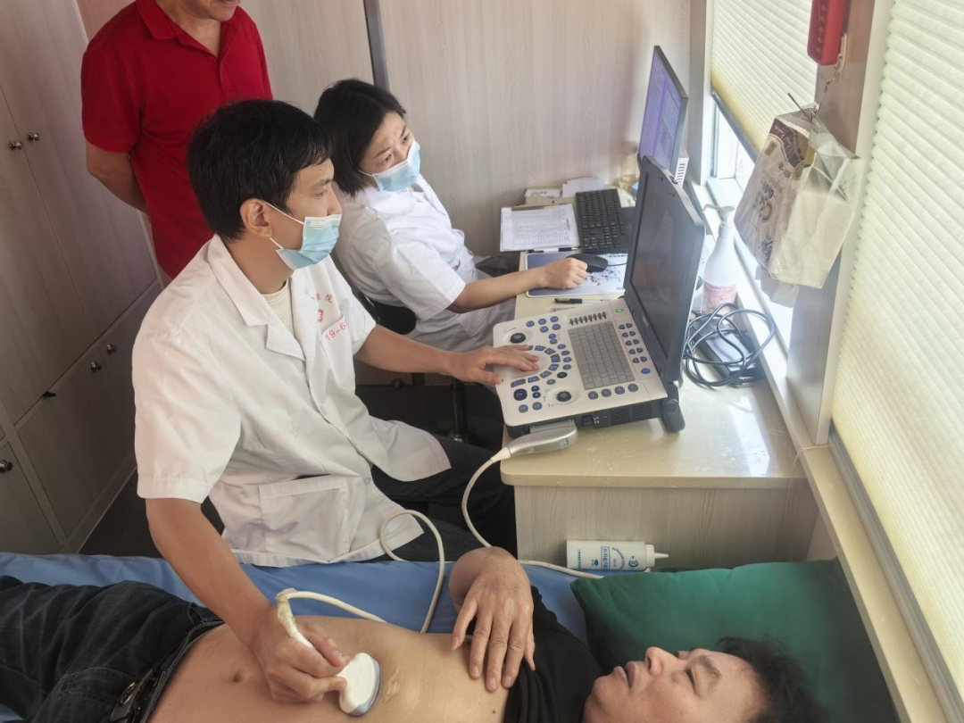 23日,优抚对象在医疗巡诊车上进行腹部彩超检查