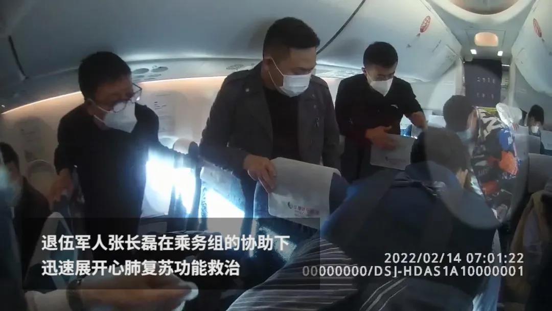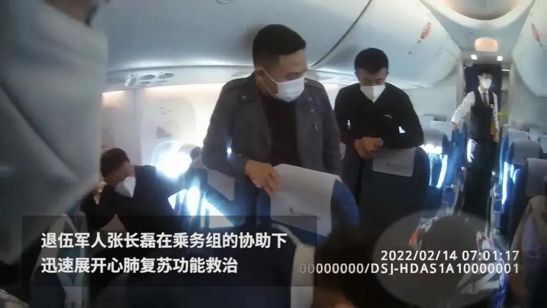 说话间,一名2021年12月刚从漳州退伍的安徽籍老兵张长磊来到患者乘客面前,看到患者双目圆睁、面无血色,情况十分危急。张长磊顺势摸了一下患者手腕,没有心跳反应,在乘务组的协助下,随即将患者扶在过道上平躺着,利用部队所学急救常识,展开心肺复苏功能救治。与此同时,机组拨打了地面120,请求做好急救准备。仅仅过了三分钟左右,经过张长磊的救助,旅客马先生突然坐了起来,渐渐恢复了意识,在乘务员及其他乘客的帮助下,大约过了半小时,马先生脸上逐渐变得红润,意识也较清醒了。