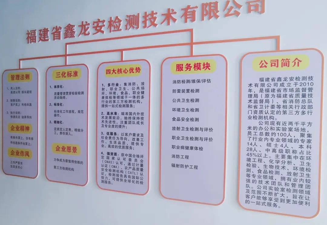 从2010年创立至今,历经11年发展,如今的鑫龙安公司,已经发展成为厦门乃至东南沿海为数不多的,能够提供多行业、全方位检测技术服务的检测机构。