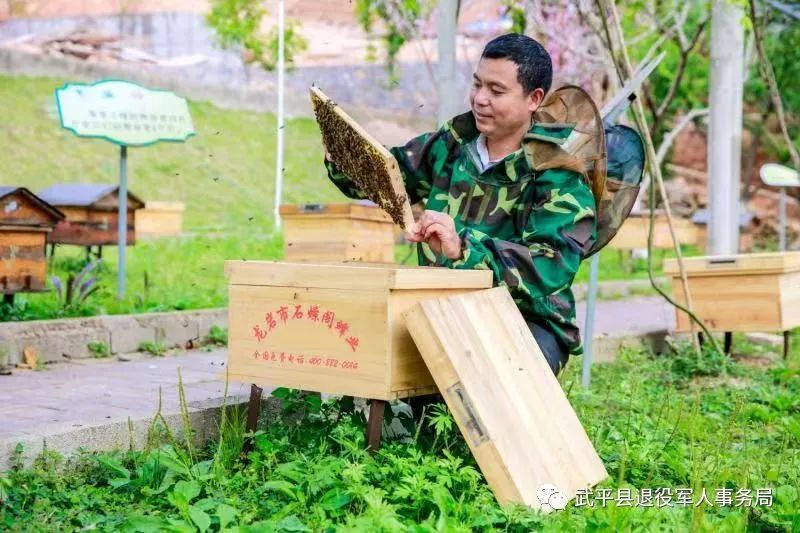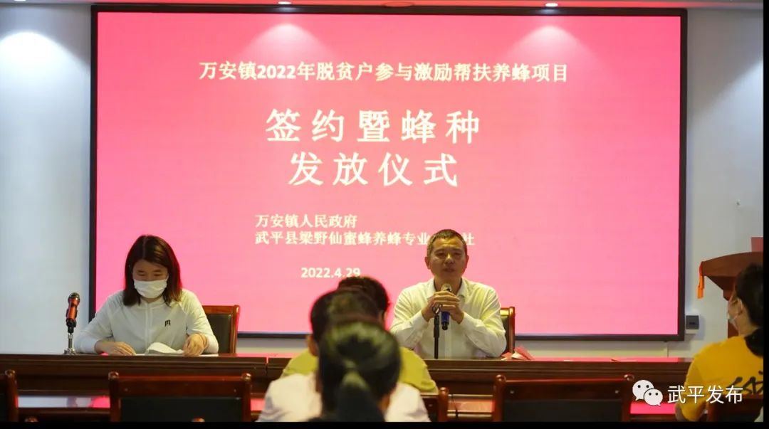 近日,武平县万安镇2022年脱贫户参与激励帮扶养蜂项目签约暨蜂种发放仪式在石燎阁蜜蜂科普基地举行,基地负责人退役老兵钟亮生为10位帮扶脱贫户现场颁发了蜜蜂认养证书,并指导他们做好蜜蜂日常管理。