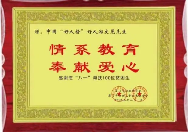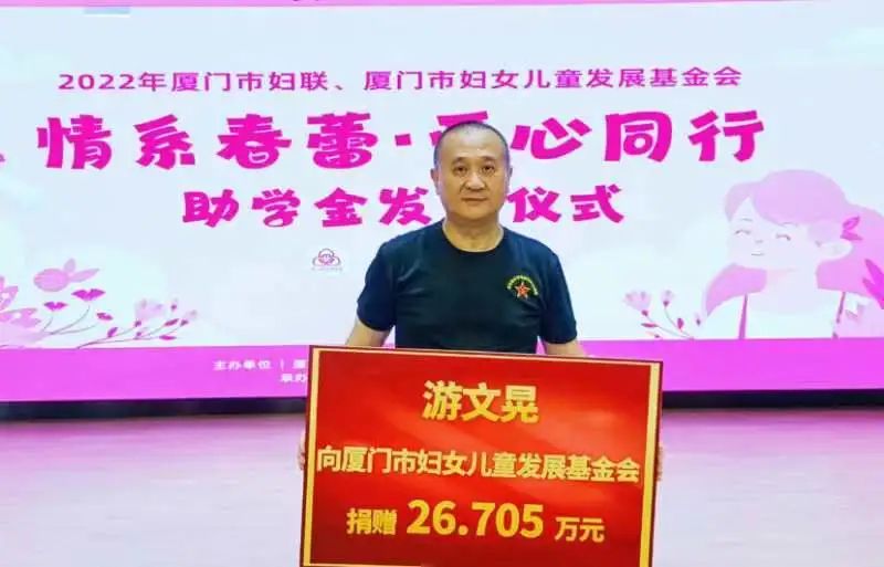 近日,在厦门市妇联、市妇女儿童发展基金会主办的2022年“情系春蕾·爱心同行”助学金发放仪式上,“中国好人”游文晃又为厦门的贫困生提供26.7万元助学金。日前,他又前往福州,将18.5万元助学金交到福建省妇女儿童发展基金会春蕾贫困生的手上。