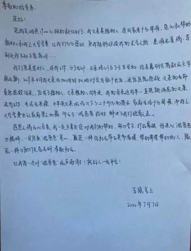 王建平女儿在给游文晃的回信中写道:“多亏了‘游爸爸’救助,解决了我们燃眉之急。我一定不辜负您对我们的帮助。将来我要以‘游爸爸’为榜样,一定传承‘游爸爸’的爱心。”