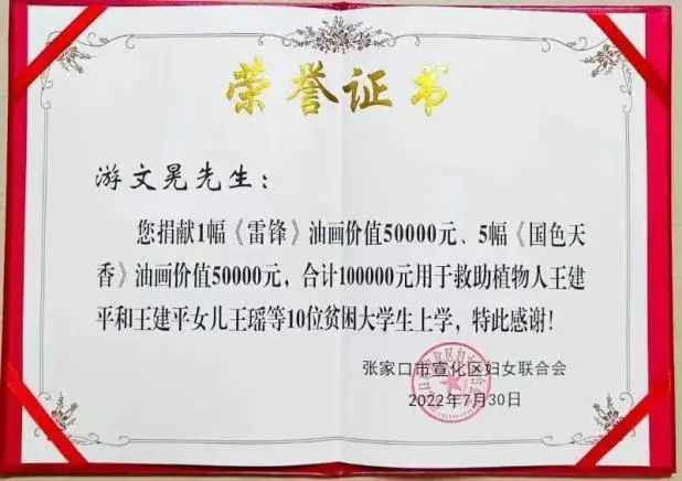 2019年,“游好人”原部队所在地王建平突发脑干出血,成了植物人。妻子为照顾病危的他,没办法工作,治疗4年欠下了20多万元债务,秋季开学前夕,王建平女儿面临大学学费难题。得知这一家的情况,游文晃将义卖油画所得的其中19000元汇给王建平女儿作为学费。