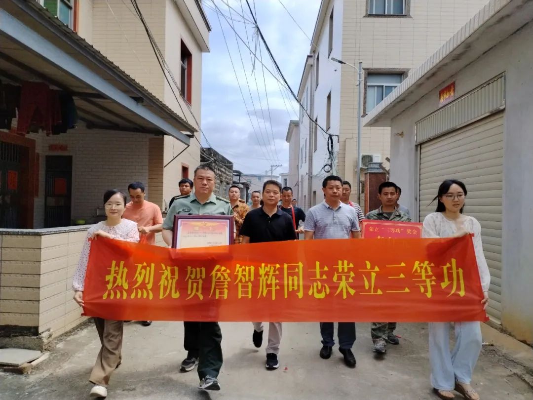 5月6日上午,漳浦县人武部、漳浦县退役军人事务局、盘陀镇等相关军地领导到盘陀镇上洞村现役军人詹智辉的家庭送去立功喜报。当地村民沉浸在锣鼓喧天、鞭炮齐鸣的热闹氛围里,军地领导分别为其家属佩戴“一人立功全家光荣”绶带、送上慰问金及暖心问候与祝福。