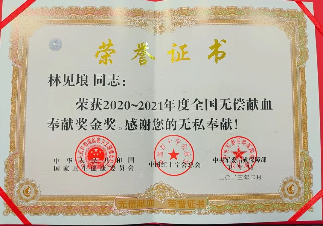 林见埌,先后获得全国无偿献血奉献奖金奖2次、银奖1次、铜奖2次。他从事客车运输工作,工作繁忙仍坚持献血,被队员们称为“最能跑的热血超人”。