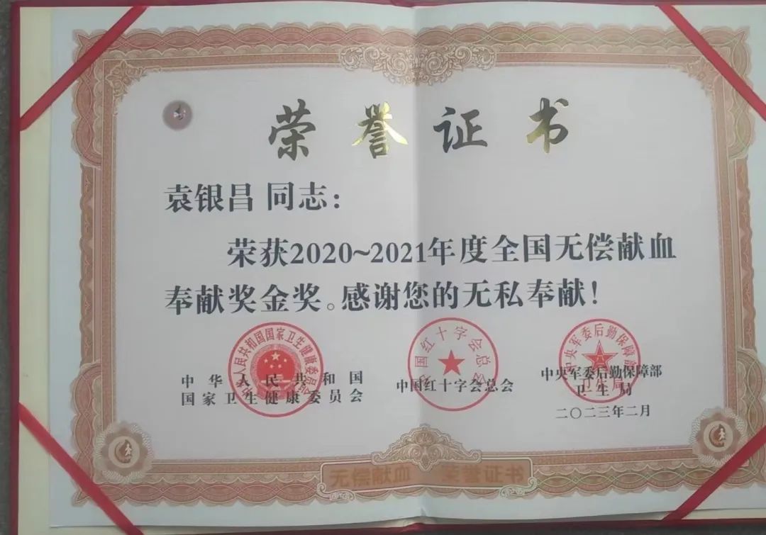 袁银昌,2011年开始参与无偿献血,累计献血73次,献血量18200ml。
