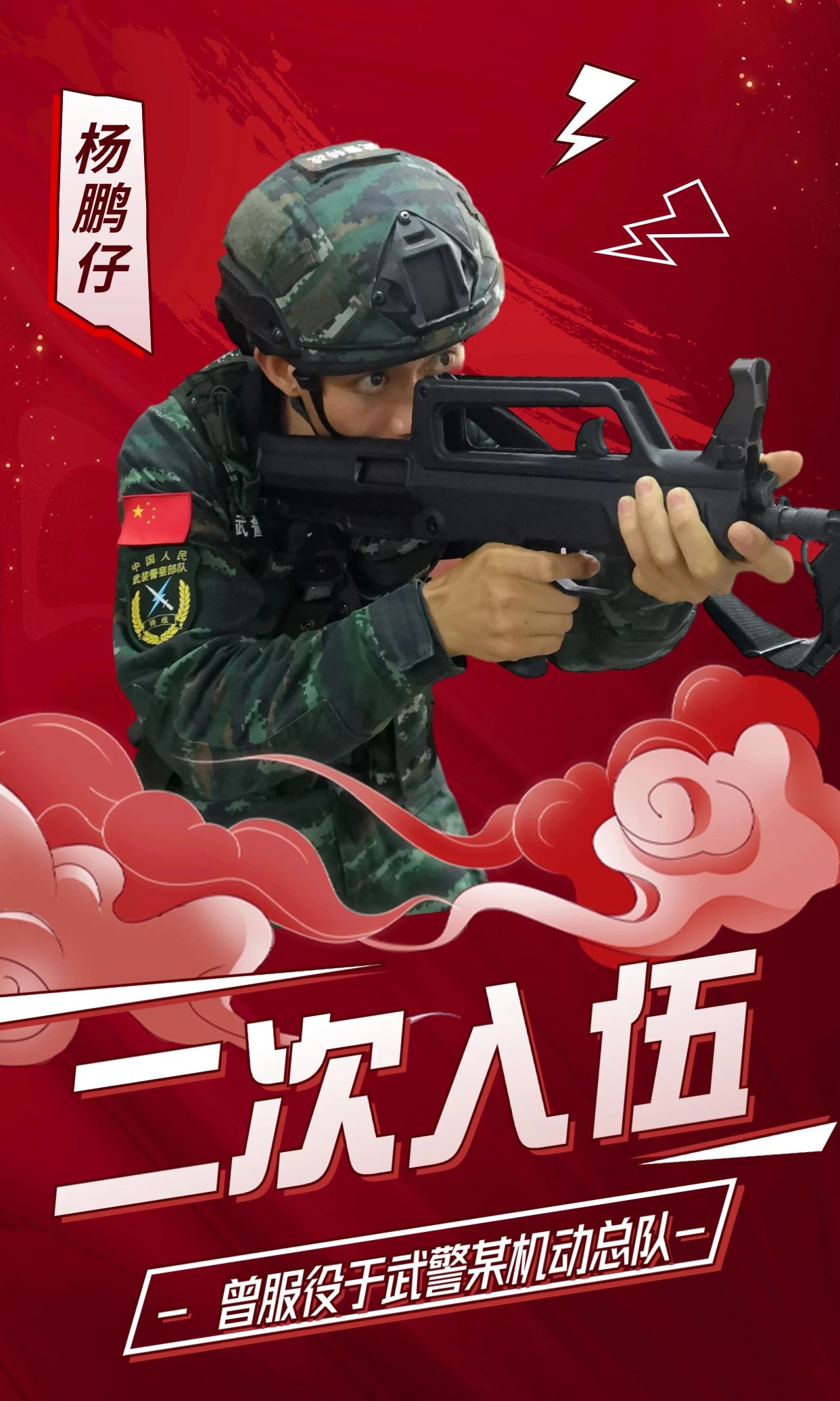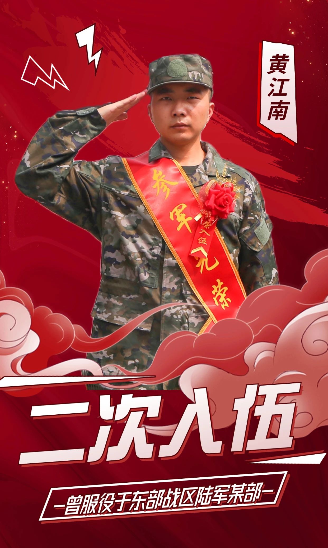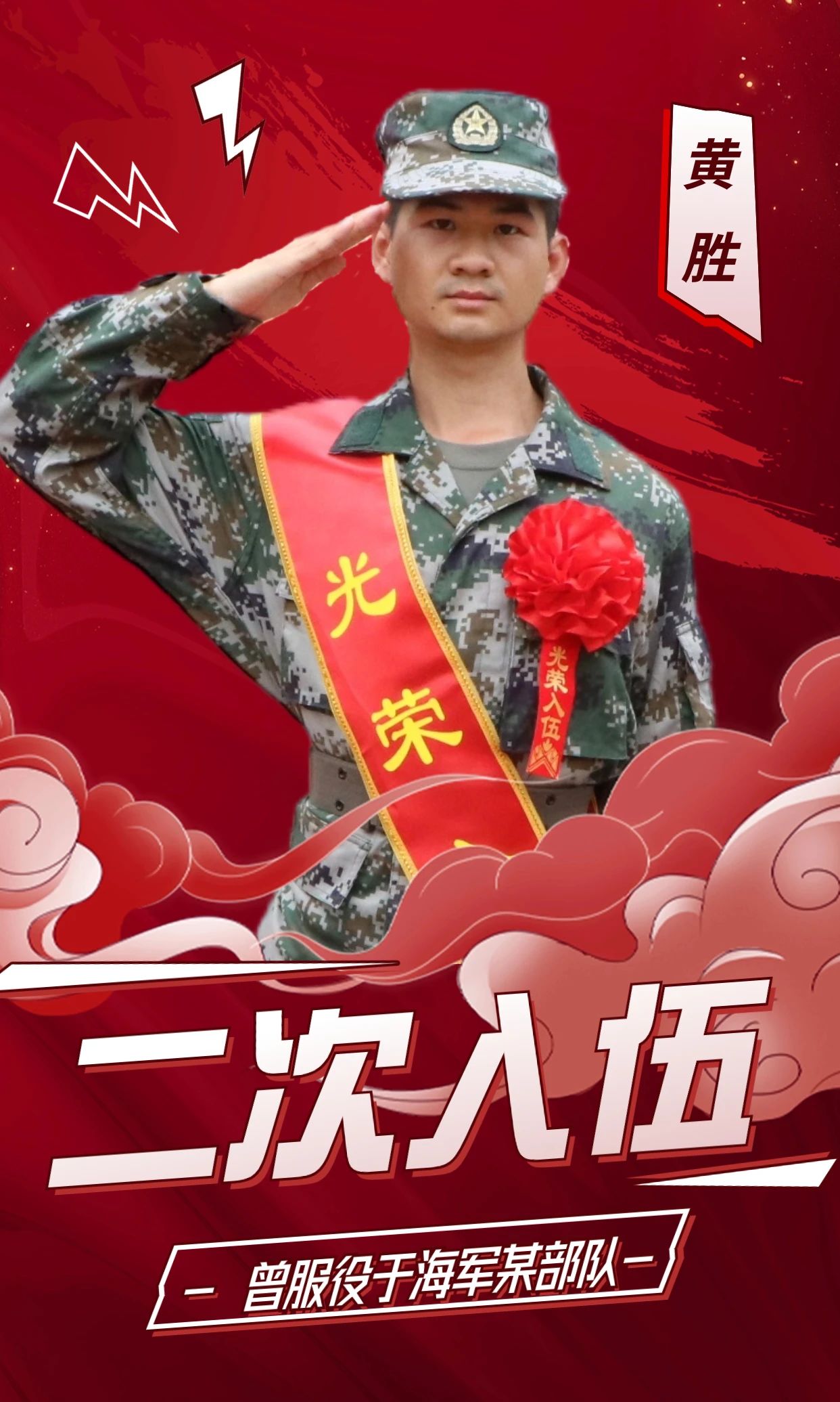 从小就有着军装梦的他,义无反顾的选择参军报国,第一次踏进武装部当预备役时,心情就显得格外激动,通过一年的锻炼,体检政考等层层考核和筛选,终于步入了军营,在部队的2年里成熟了思想、锻炼了意志、提升了素质……由于学历问题,退役回来后继续完成学业。但黄胜一直很怀念部队的生活和为报效祖国的坚定决心,在年龄允许的范围内,他再次选择“二次入伍”,再次踏上军营的列车,报效国家。