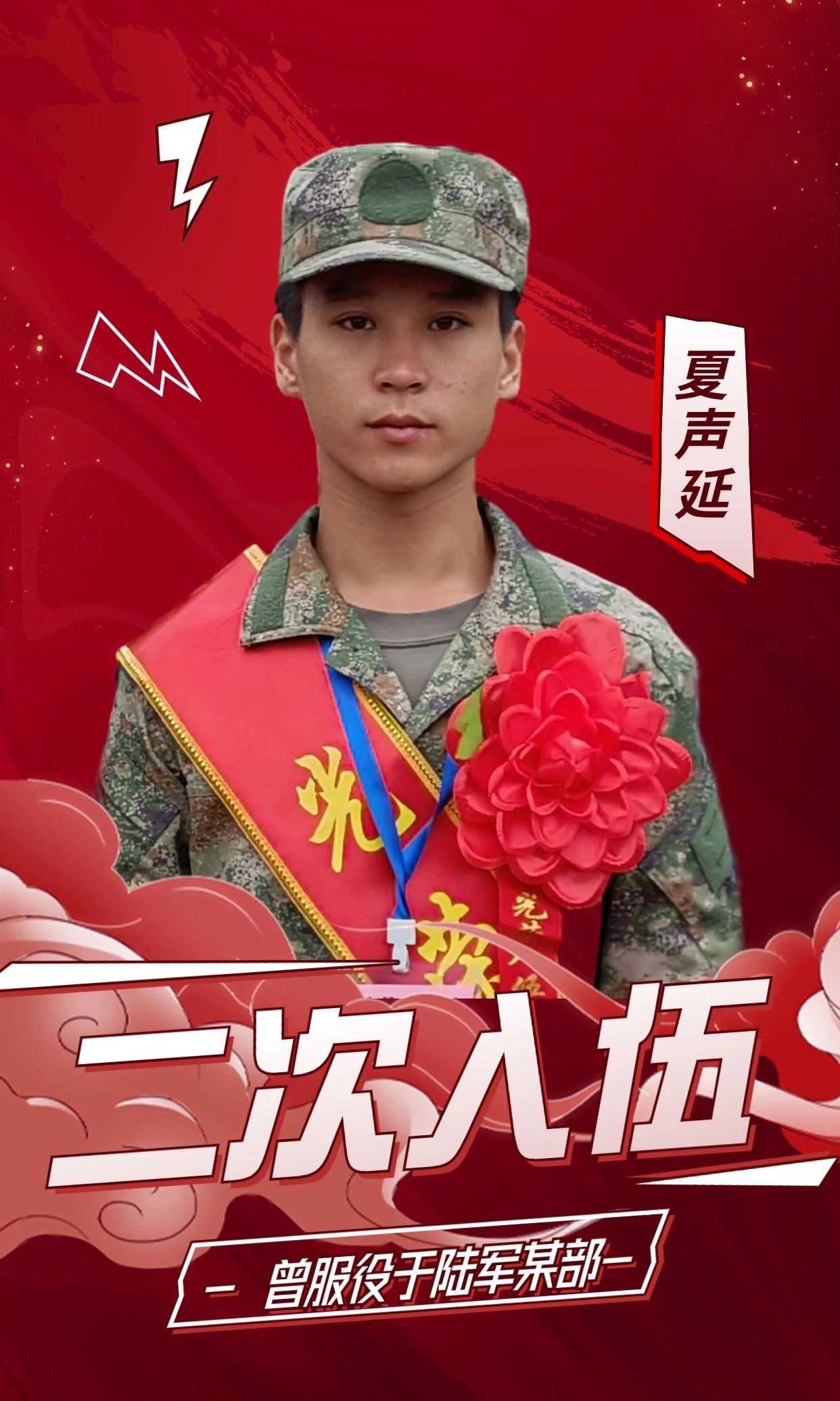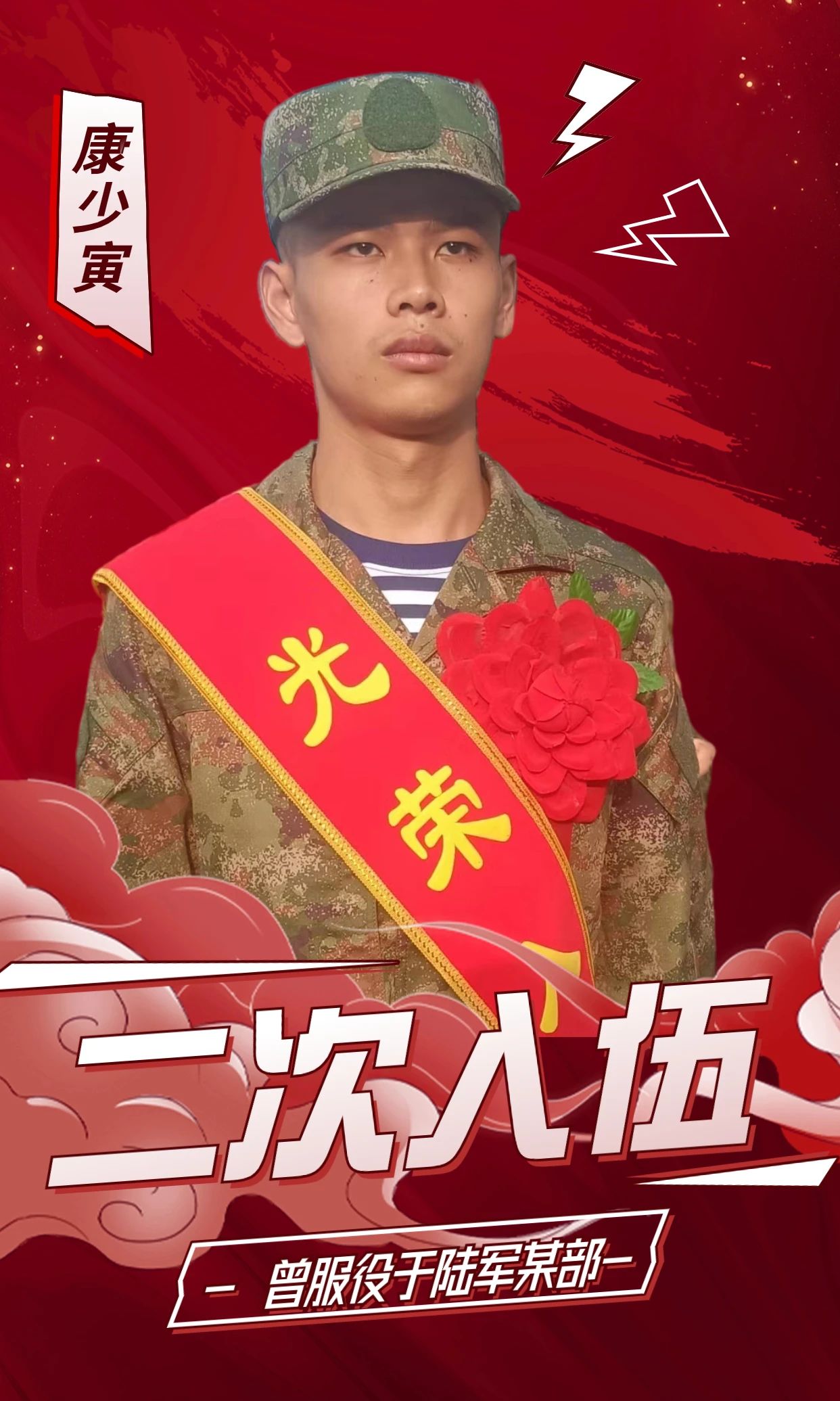 来自泉州市永春县的康少寅曾服役于陆军某部,在服役期间表现优越,被评为“优秀义务兵”,受学业问题不得不脱下军装。当被问到为什么选择二次入伍时,康少寅表示:“从第一次当兵就下定决心二次入伍,二次入伍多的是一份责任,一份对中国人民解放军使命的责任,我想拿起这份光荣的使命,想为祖国和人民再站一次岗。”