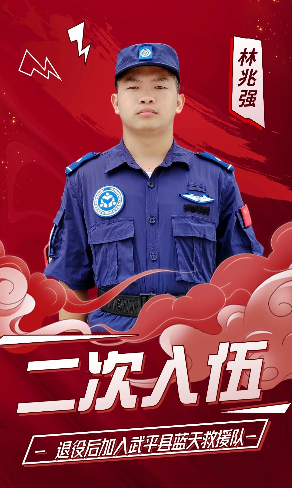 2022年,龙岩市武平县的林兆强退伍回乡后,发扬“退伍不褪色退役不退志”的优良作风,积极加入公益救援机构武平县蓝天救援队,参与各类救援与公益活动,用奉献诠释军人本色,用行动书写忠诚、责任、担当。