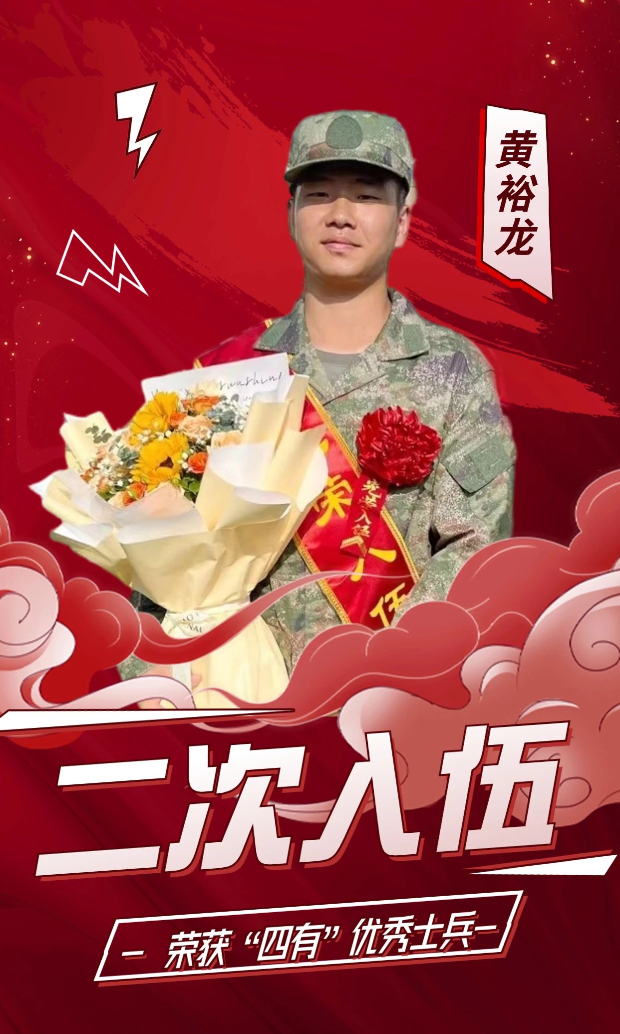 在第一次服役期间,黄裕龙因表现突出荣获“四有”优秀士兵,获评“感动军营人物”“钢铁卫士”荣誉称号。此次,黄裕龙怀着扎根军营、建功立业的梦想再出发,希望能够在部队长期干下去,让青春在军营再次发光!