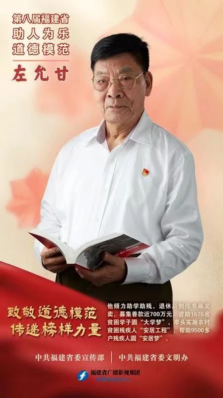 左允甘,1943年10月出生,1963年8月参加中国人民解放军,1965年8月加入中国共产党,1992年转业后,历任福州市委常委、市纪委书记,福建省纪委副书记,省人大常委会委员、省人大法制委委员。2008年12月退休后,他倾力助学助残,创作书画进行义卖,募集善款近700万元,资助1600多名贫困学子圆“大学梦”,帮助20多名特困学子解决家庭困难,牵头实施农村贫困残疾人“安居工程”,帮助9500多户农村贫困残疾人家庭圆“安居梦”。