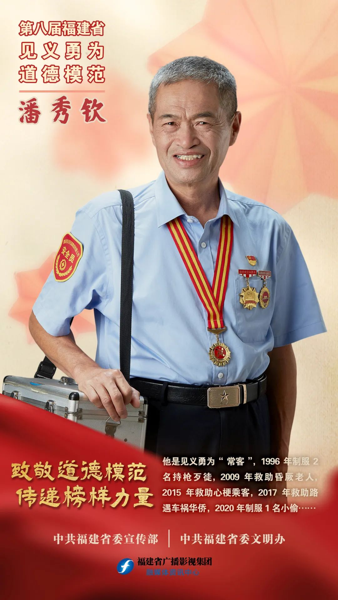 潘秀钦,1962年7月出生,莆田市公共交通集团有限公司退休职工。他见义勇为数不胜数,1996年制服2名持枪歹徒,2009年救助昏厥老人,2015年救助心梗乘客,2017年救助路遇车祸华侨,2020年制服1名小偷,2022年救助1名车祸伤者,处处彰显退役军人“退役不褪色”的奉献牺牲精神。