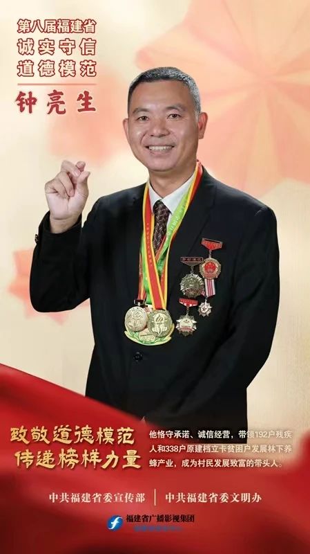钟亮生,1975年9月出生,2022年度“最美退役军人”,龙岩市武平县梁野仙蜜养蜂合作社党支部书记、理事长。他恪守承诺、诚信经营,带领192户残疾人和338户原建档立卡贫困户发展林下养蜂产业,成为村民发展致富的带头人,也成为传播大爱、兼修品德的好模范。