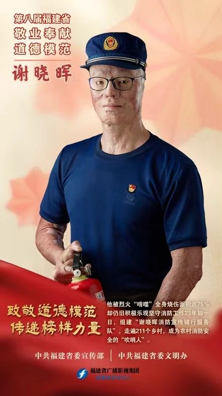 谢晓晖,1977年3月出生,三明市永安市消防大队退休军人。他被烈火“啃噬”,全身烧伤面积达75%,却仍旧23年如一日积极乐观坚守消防工作。他组建“谢晓晖消防宣传骑行服务队”,走遍211个乡村,入户宣传1万余次,培训人数超5万人,成为农村消防安全的“吹哨人”。