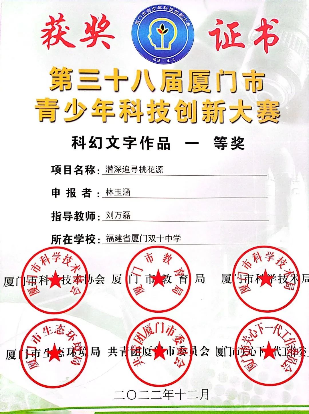 入校至今,曾获新教师常态化课堂教学比赛一等奖、班主任技能大赛一等奖、我的德育故事比赛一等奖、中华魂·中华好家风主题班会特等奖、厦门市“诵读中国”朗诵比赛三等奖、福建省军事课教学竞赛高中阶段学校组二等奖,“基础教育精品课”市级优课,所撰写论文收入厦门市汇编。入职后获评“优秀班主任”“优秀教师”等荣誉称号。