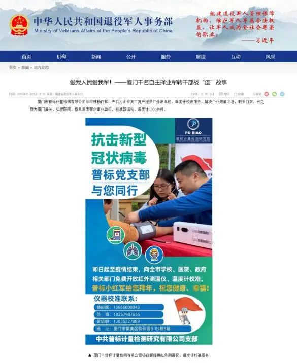 2020年1月24日(除夕),身兼普标支部书记的杨白辉,第一时间召开支部会议,部署抗疫工作,并亲自起草文宣。免费为厦门市学校、医院、政府等相关部门免费校准红外测温计、温度计等上千件;设立24小时值班制度,推出“电话铃响,十分钟到场”的校准服务;退役军人、共产党员逆行走进医院、企业等单位开展校准检测服务,提供技术支持;联合厦门市卫健委举办“急救、生命支持类设备计量与质控培训”,提供免费技术指导……三年来,在杨白辉的带领下,普标党支部系列抗疫故事获国家退役军人事务部点赞,《厦门日报》《中国网》《中国企业网》等媒体也纷纷报道普标党支部“战”疫故事。