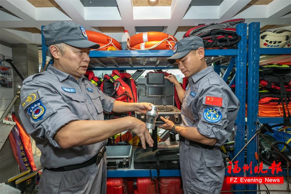吴霄翔(左)与星光救援队负责人欧阳光(右)在操作救援设备