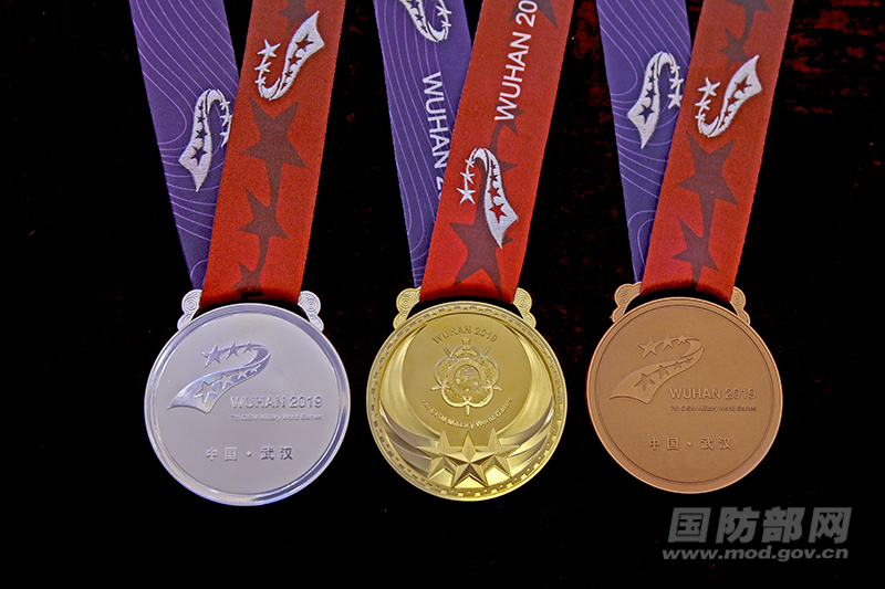 军运会奖牌名为“和平友谊之星”,直径81mm、厚度5mm, 金牌采用黄铜镀2克金,银牌采用紫铜镀2克银,铜牌为紫铜上色。采用高支高密真丝面料,会徽刺绣图案色彩鲜明,线条流畅清晰。除常规的CISM(国际军体)标识和第七届世界军人运动会会徽以外,奖牌还融入了五角星、翅膀、道路、赛跑的冲刺撞线带、长城、梅花、黄鹤楼建筑形象等视觉元素。军运会奖牌具备以下几个特点: