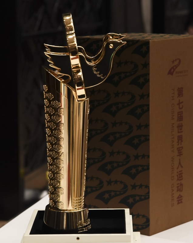 军运会奖杯名为“腾飞”,以梅花、抽象的和平鸽为设计主元素,与军运会会徽的数字“7”、跑道、祥云图形组合构成。一飞冲天的和平鸽造型,既体现“共筑世界和平”之意,也寓意运动员拼搏、向上,再创世界军运会佳绩。数字“7”表示第七届,跑道表示运动会,祥云为吉祥如意,也表示白云黄鹤之乡的含意。梅花的五片花瓣,紧扣奥林匹克五环图形,体现“更快、更高、更强”的奥林匹克精神。